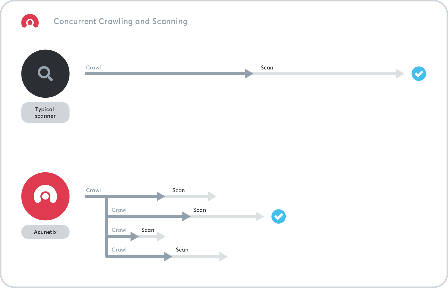 The Acunetix engine is written in C++. C++ is a low-level programming language, which means that its compiled code is converted to machine code, making it easier for computer hardware to understand. This makes it very fast and this is why we chose C++ to develop the Acunetix engine. High-level languages such as Java or C#, which are used to develop most applications, are easier for programmers. However, code from these languages is compiled into an intermediary language, which the computer must translate into something that the hardware understands, and this occurs during application execution. As a result, program execution is much slower. Additionally, the Acunetix scanning engine is designed so that it minimizes the number of requests required to test for vulnerabilities. This further speeds up the engine by reducing the potential negative impact of network bandwidth and server load capabilities.Concurrent Crawling and Scanning