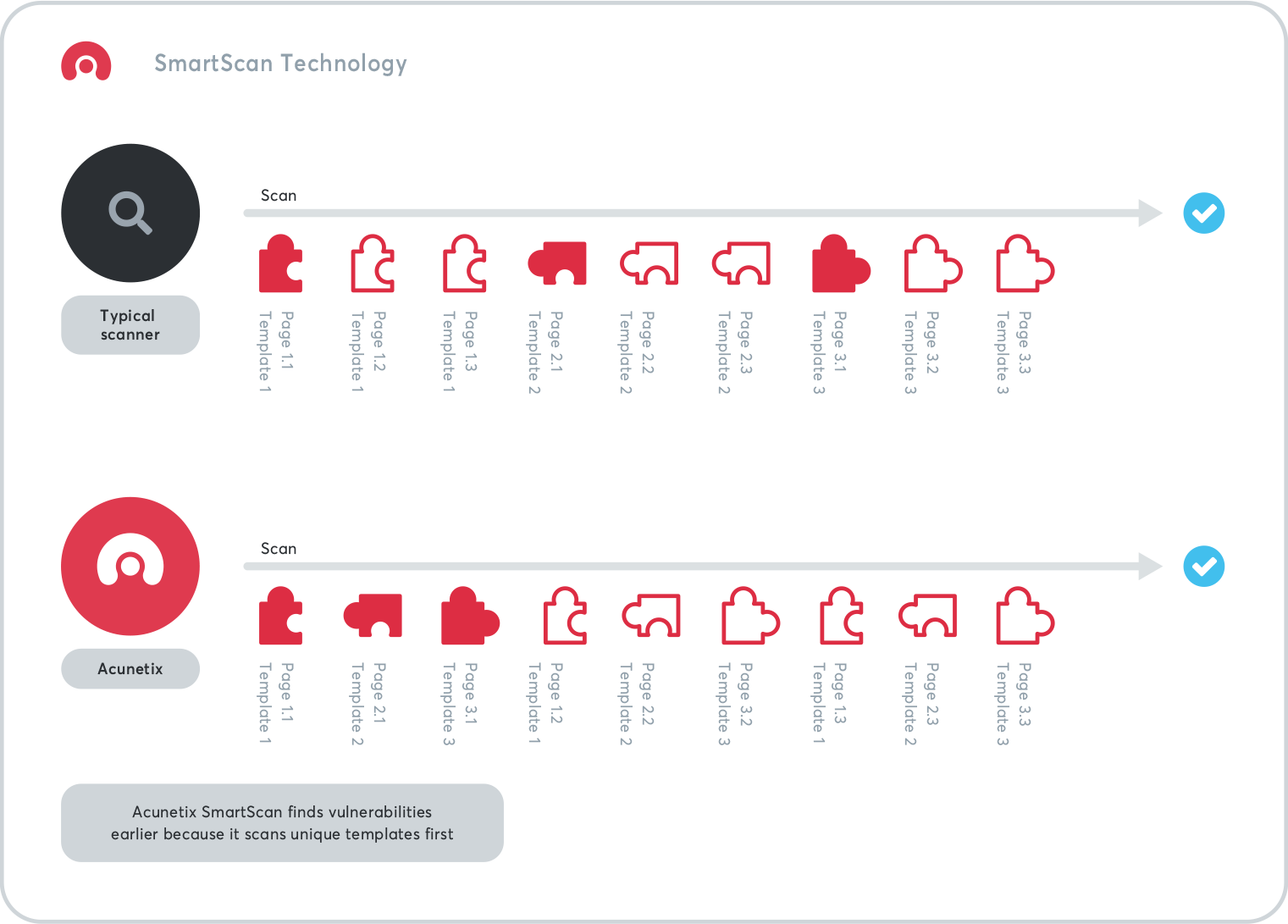 Most web vulnerability scanners work in two phases. First, they crawl the website or web application and determine every possible entry point. After this is completed, they start scanning each page one by one. Acunetix takes a different approach, creating specialized tasks for the scanner. The first task is an initial request to the web application. The response is analyzed and a set of new tasks is created – these can be crawling or scanning tasks. The Acunetix scanner proceeds through the tasks using multiple, dynamically allocated threads to better utilize the machine’s resources.SmartScan Technology