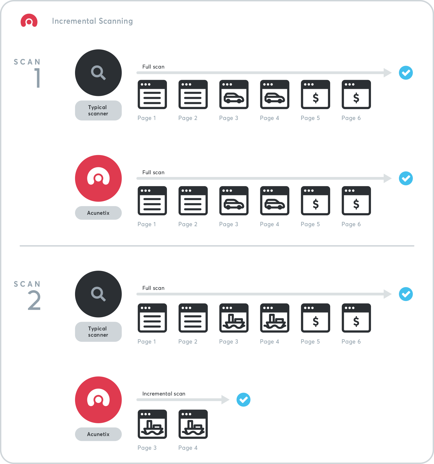 Even with our fastest scanning engine, large web application scans may take many hours. This could be due to network capacity, server capacity and load, and many other factors independent of Acunetix. Therefore, we came up with a technology that helps you get meaningful results as quickly as possible even if your scan is delayed by other factors. The Acunetix SmartScan technology dynamically prioritizes the tasks described above to scan elements on the site, such as pages or forms, which appear dissimilar from elements that have already been scanned. In the case of larger sites, many web pages are based on the same templates and therefore would behave in a similar way even though the content might be different. A crawler often queues these pages for scanning one after another. However, if you scan many pages based on the same template, you usually don’t find any new vulnerabilities. Instead, Acunetix recognizes pages that are similar to those already scanned and pushes them to the back of the queue. This way, the first pages that are scanned are all unique. Depending on the site being scanned, this can mean that you can get up to 80% of the vulnerabilities discovered in the first 20% of the scan.Incremental Scanning